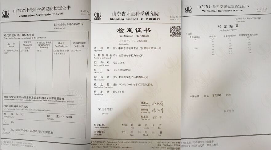 為了更好的交付這批設(shè)備,確保設(shè)備測(cè)試數(shù)據(jù)的準(zhǔn)確性,濟(jì)南賽成儀器向山東省計(jì)量科學(xué)研究院提出了檢定申請(qǐng)。依據(jù)JJG475-2008電子式萬能試驗(yàn)機(jī)的檢定規(guī)程,省計(jì)量院工作人員對(duì)XLW-L包裝袋電子拉力試驗(yàn)機(jī)的精度和誤差等進(jìn)行了檢定,經(jīng)檢定結(jié)論達(dá)到0.5級(jí),檢定結(jié)果合格。2020年8月9日獲得山東省計(jì)量科學(xué)研究院頒發(fā)的檢定證書,獲得的這份檢定證書,進(jìn)一步證明了濟(jì)南賽成儀器符合預(yù)定要求和質(zhì)量要求,測(cè)量結(jié)果準(zhǔn)確,儀器持續(xù)可靠,性能穩(wěn)定。
